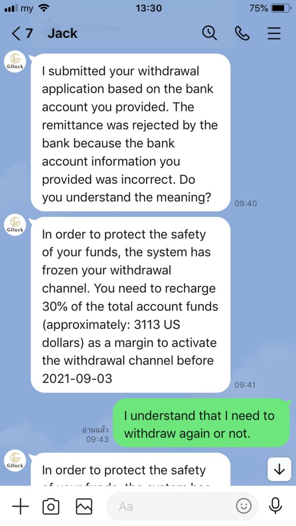 Glluck แจ้งต้องการถอนเงินค้องใส่เงินลงไปก่อน สรุปค์อถอนเงินไม่ได้ มีเงินอยฦู่ 10375 us มีความเสี่ยงถูกโบรกเกอร์โกง
