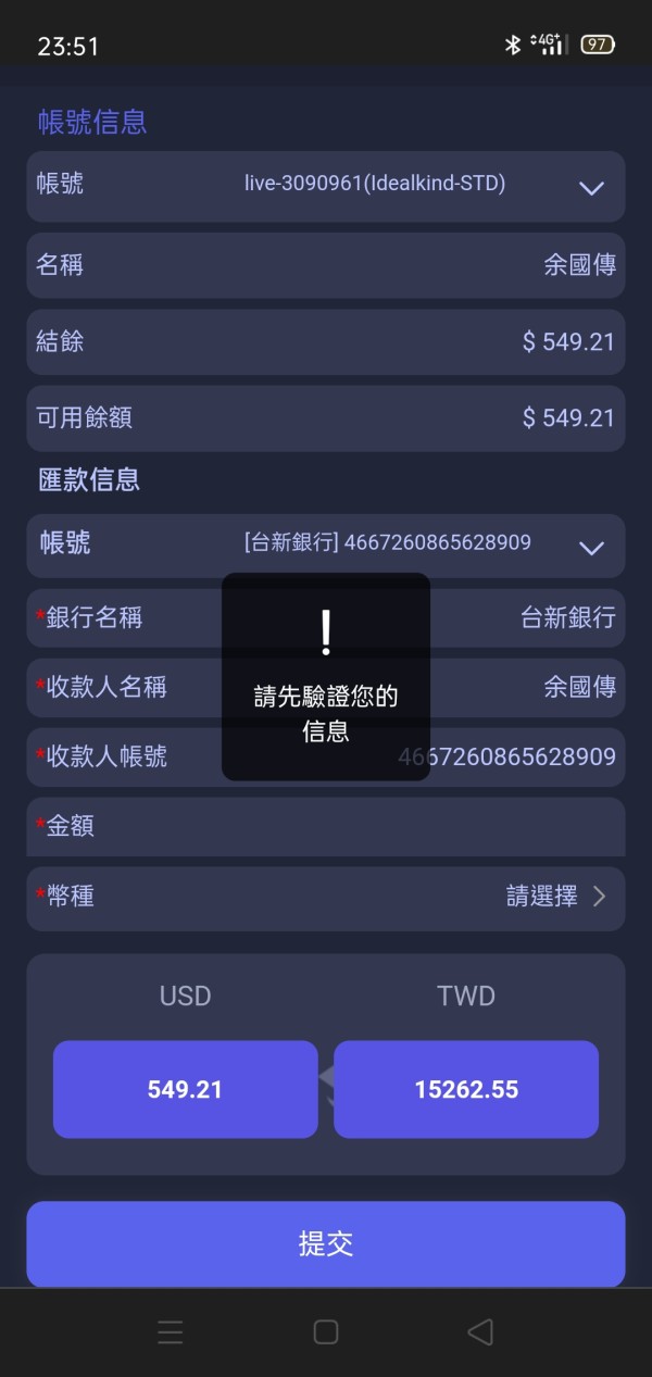 我是台灣的客戶申請出金已經7天,身份證也已經上傳。但是出金時卻都出現(請先驗證您的信息)