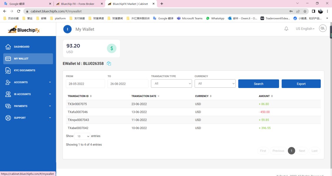 bluechipfx电话销售联系到我,我六月份在这个凭条开户入金交易,后续出金后台会给你通过但是根本不会大钱给你,去了办公室要钱也要不到,投诉无门真惨,这种平台大家千万不要投资。