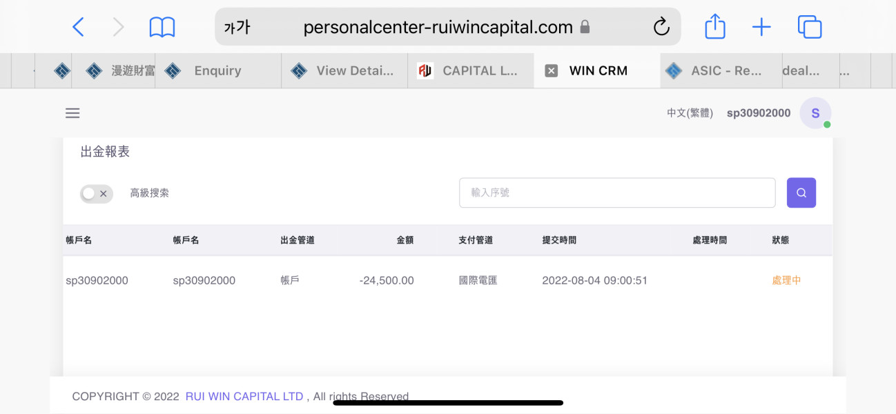 RUI WIN CAPITAL 網址有兩個,網址不同但是頁面是一摸一樣的,不知道為何會有兩個網址! https://ruiwincapital.com https://ruiwinaa.com 於7月30日週六提出一次,週一8月1日修正一次後客服統一回答1-3工作天, 而後本該是要入帳的時間卻還是能一再修改即表示根本沒有要讓人提現的意思! 查詢過天眼的平台,看到此公司受監管的,8月4日經查詢,此交易商已無受澳洲ASIC監管! 後續還提到有60%風險金,試問這合理嗎? 表示入金後覺得交易商不ok想換的話是換不了的?事先都沒有講到這個,若是有誰要入金?這個不合理的條件! 台灣及澳洲部分已經報警,但不管是台灣或是澳洲警察皆說,本金難以回來!也通報澳洲ASIC但還未收到任何聯繫! 目前僅希望本金可以拿的回來!