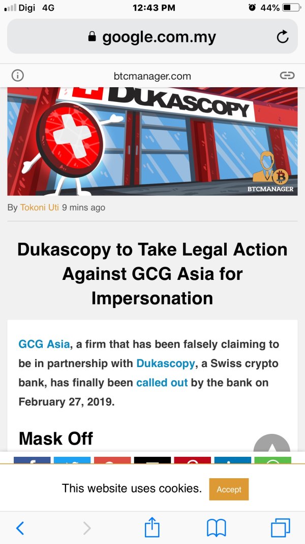 誤導及欺骗投资者,説他们是一家专业合格的外汇交易平台。並受瑞士管治。 Dukascopy将对GCG Asia采取法律行动进行冒充 GCG Asia是一家虚假声称与瑞士加密银行Dukascopy合作的公司,该公司终于在2019年2月27日被银行召集。
