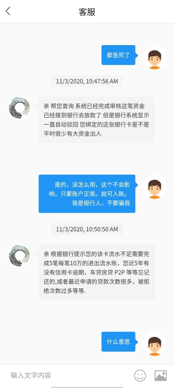 平台反应绑定的卡在平台财务账户上的流水不足,将账号冻结,需5笔10万的资金转到平台财务账户上才能放款。请解决