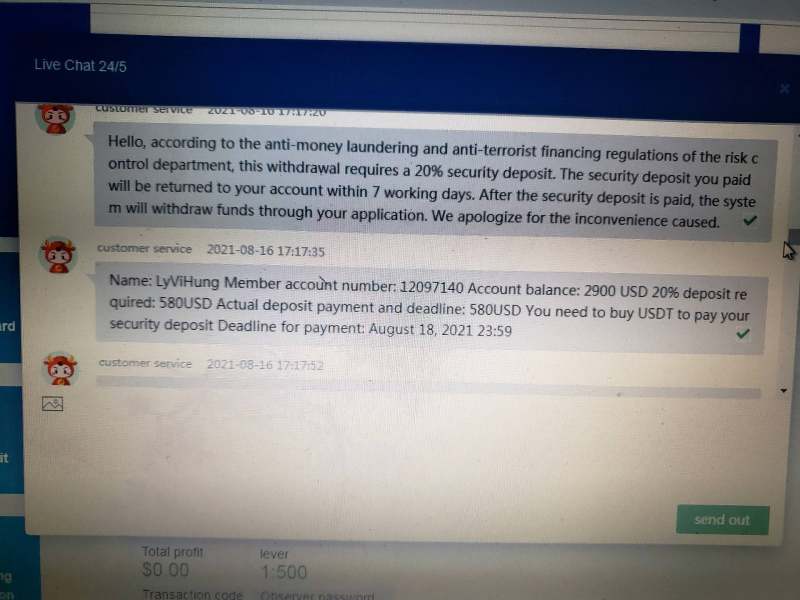 这个平台是不能出金,谁还是在这个平台投资要小心,快收手,不要入太多,我想出金时他们要我押金,我押金好他们要我纳税,全部钱都通通给他们,他们还是不给出金。下面是照片。 mọi người không nên đầu tư ở sàn giao dịch này , vì nó là sàn giao dịch lừa đảo , tui rút tiền thì tụi nó kêu đặt cọc , cọc xong rồi kêu tôi nạp thuế , thuế và cọc đều đưa tụi nó , sau đó thì mới chịu rút tiền cho tôi , kiểu này là lừa gạt , mọi người cẩn thận , nó khóa tài khoản tôi luôn rồi , may mắn tôi chụp lại được hết đoạn thoại , hình ảnh bên dưới , cảnh tỉnh cho mọi người