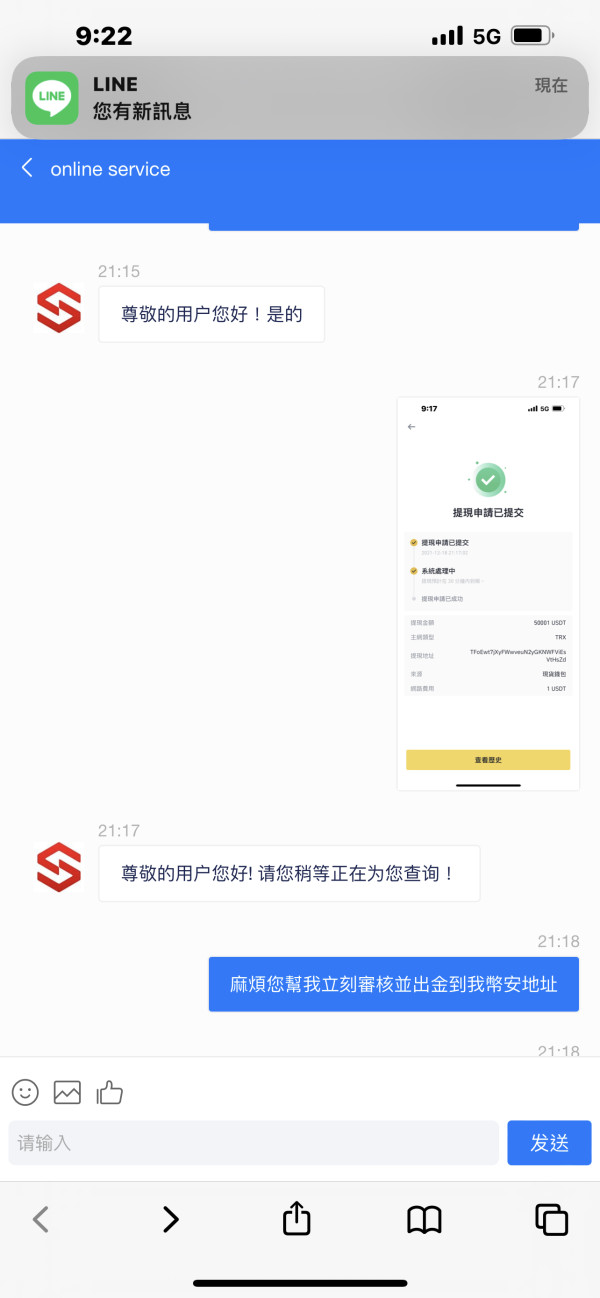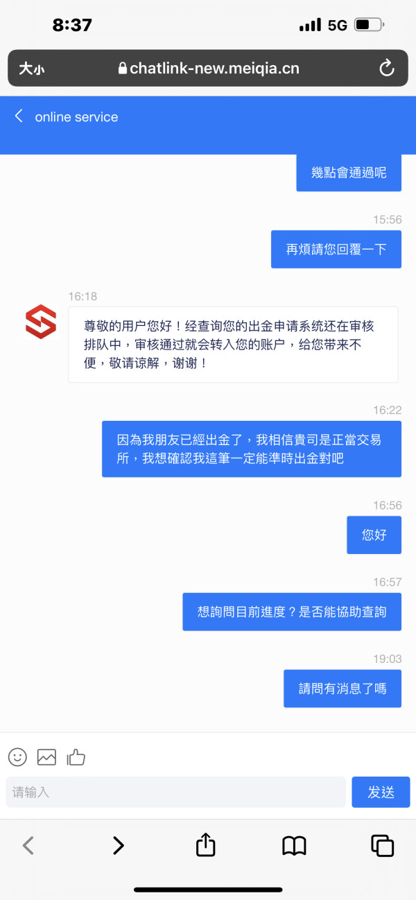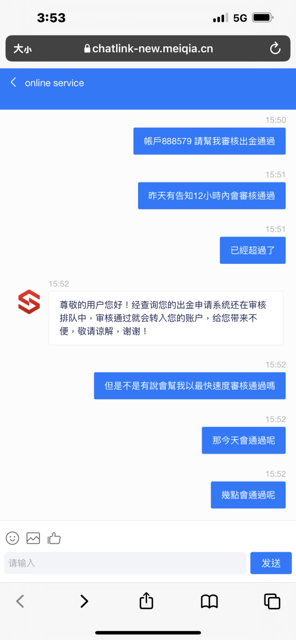 繳納完成後,出金審核從10分鐘變30分鐘再變12小時,連一開始說最慢24小時內會出金都已超過,後來客服就再也未給予任何回覆,要求拿回申請出金之金額!