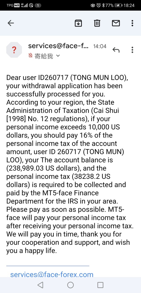搞不明白也搞不清楚 我要出金的时候平台给我发了邮件说我必须缴税款项35238.2美金才能出金