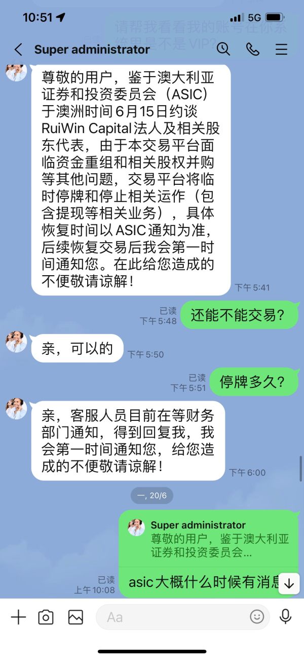 从6月开始,平台就无法出金,“尊敬的用户,鉴于澳大利亚证券和投资委员会(ASIC)于澳洲时间6月15日约谈RuiWin Capital法人及相关股东代表,由于本交易平台面临资金重组和相关股权并购等其他问题,交易平台将临时停牌和停止相关运作(包含提现等相关业务),具体恢复时间以ASIC通知为准,后续恢复交易后我会第一时间通知您。在此给您造成的不便敬请谅解!”一直到现在都1个多月了,现在连客服都联系不上了!