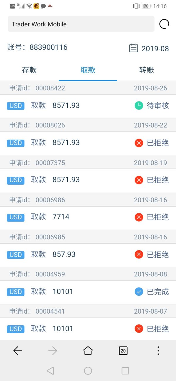 金港国际从8月13日到现在26日了,一直无法出金,申请出金拒绝,没有任何拒绝理由!希望大家不要再上黑平台的当了,并希望能解决出金问题
