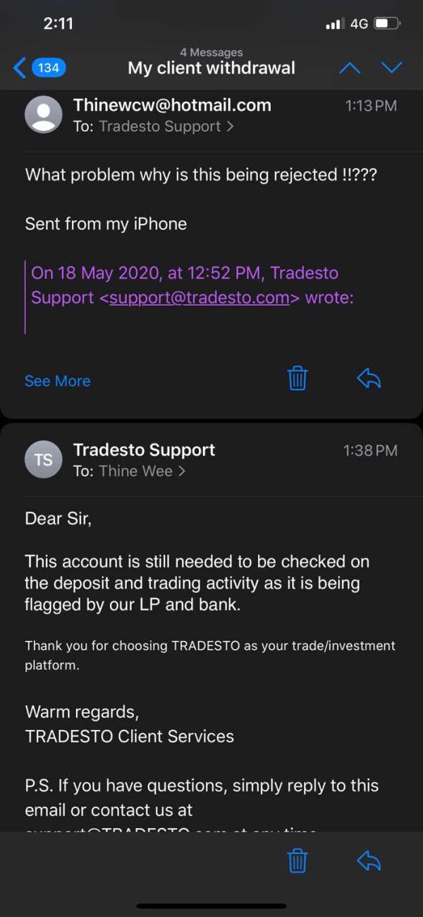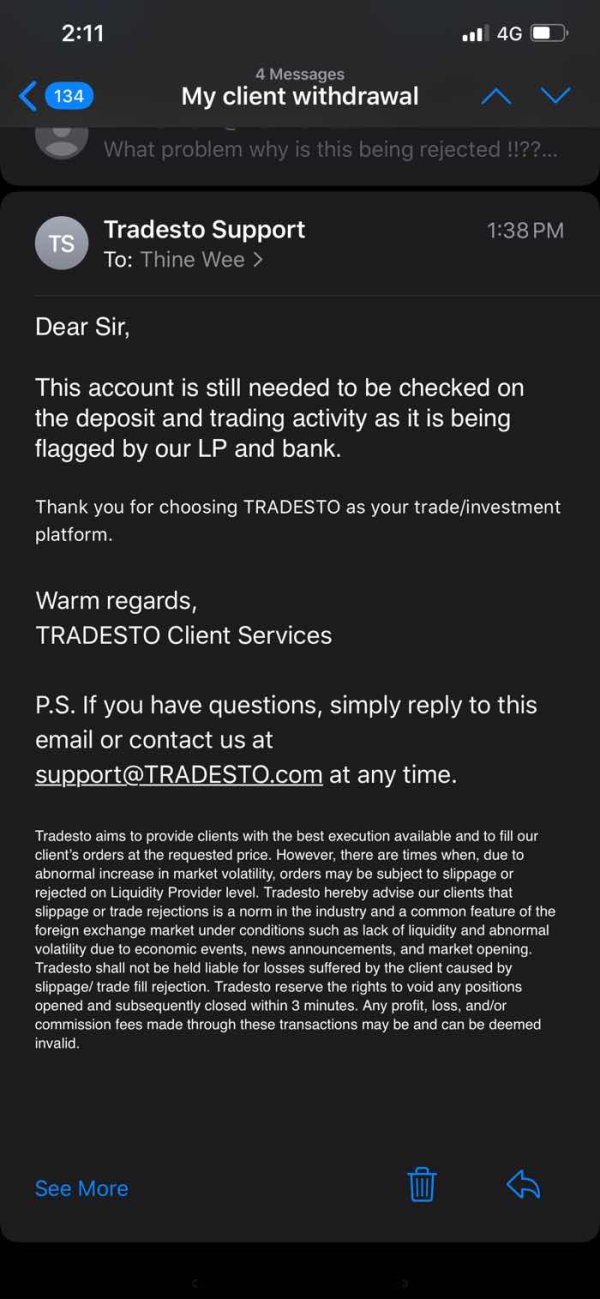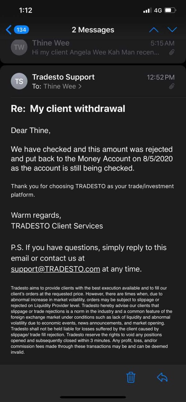 This is what happened to me as a investor, I deposited 6000usd into tradesto, but it happens that I need to withdraw my funding of 6000 usd however I did not received the money until this day. Below is the response I got from tradesto when I requested their support team to help me in this matter.