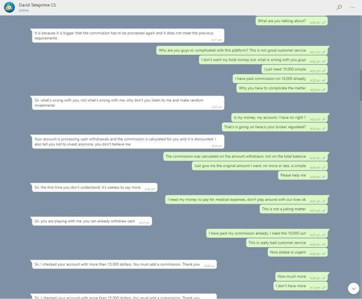 If you happen to meet someone from a dating website or Facebook talking about online trading - BEWARE! They will lead you to one of the scammer trading platforms (i.e. Tateprime.com) often not regulated and short stay. It starts with a friendly conversation, she shared with me some of her personal family photos and personal stories to gain my trust, eventually, she tells me how successful she was due to your online trading, then next thing she entrusts me with your login and asks me to give it a few trades myself, I can see why she is making so much money. Then she tells me, I can be the same as her if I trust her guidance, she only wants to help me improve my life and circumstances. She asks me to put in some small deposits since I trusted her, so I did. To register an account, I was introduced to a customer service staff named David via What's App (+601115782879- seems like a Malaysian number) They got my ID and address as part of the process, they have given me my MT4 login but intentionally never provide me my backend withdrawal login. David demand I paid 12% commission before withdraw, which I did once. after that he comlain I was trading during the withdraw process and demand another lot of commission payment, I was already broke. Now my trading account is frozen, no data feed on my MT4. Total Lost $65,000.