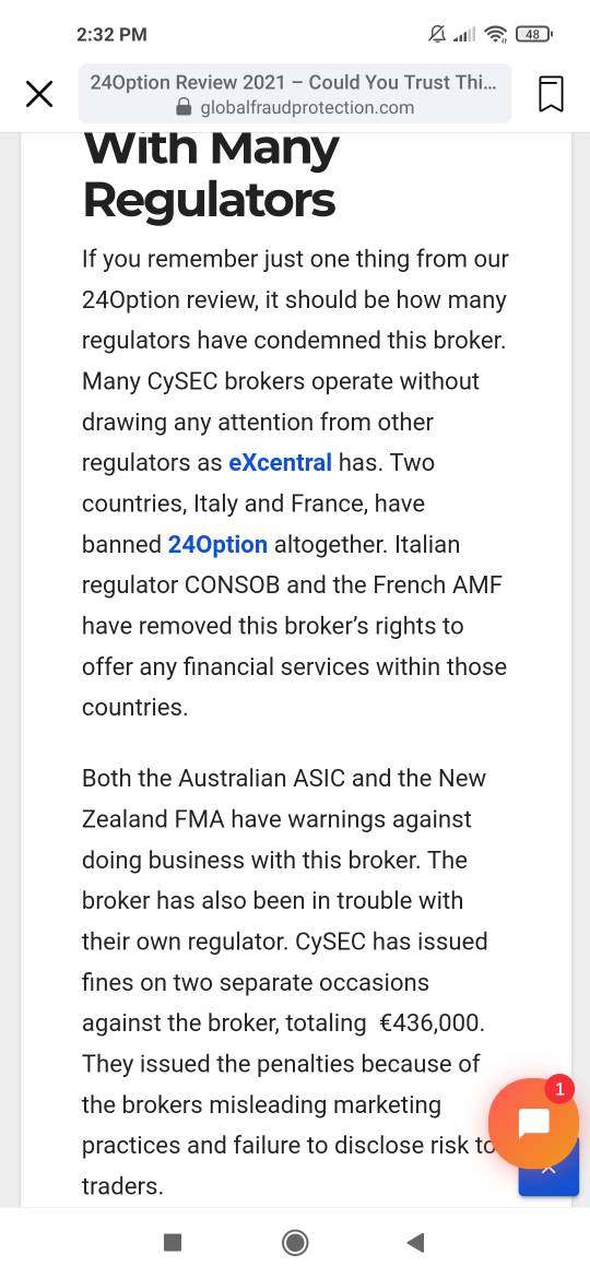 many regulatory authorities have avoided regulating 24option for various reasons. This broker is also banned from doing business in France and Italy. It is also been fined by its own regulatory company for unethical practices.