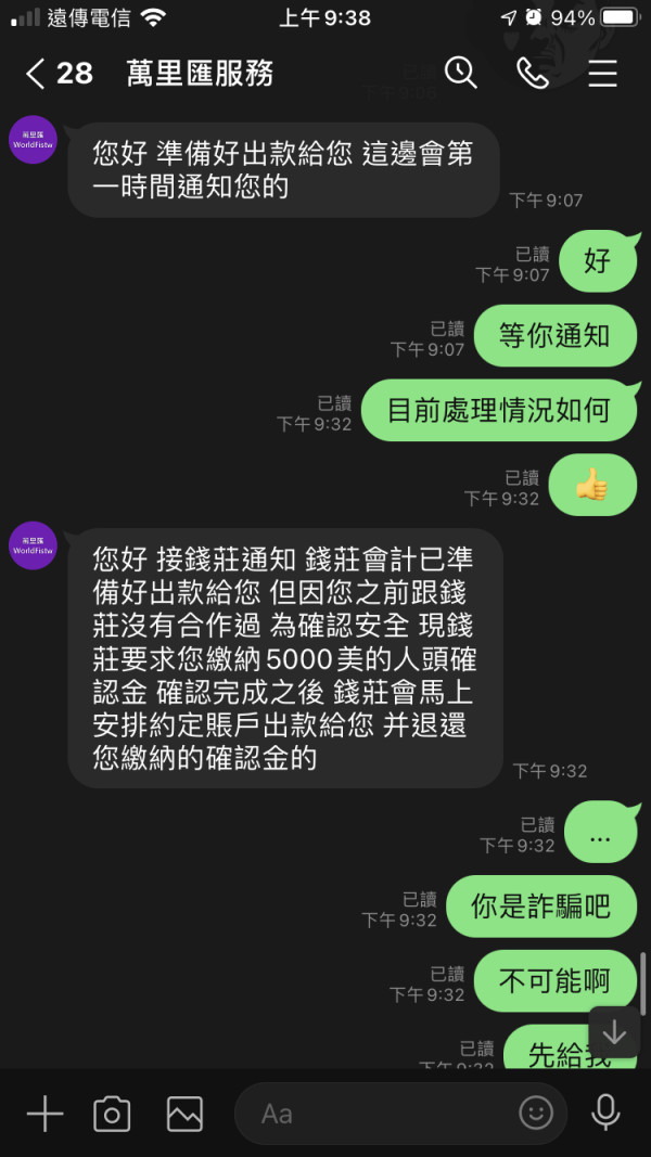 解凍之後 要將全數8460美金領出卻說公司帳戶出問題委託錢莊出款 要確認人頭戶5000美金 因說跟錢莊沒有來往紀錄 最後8460美無法出金