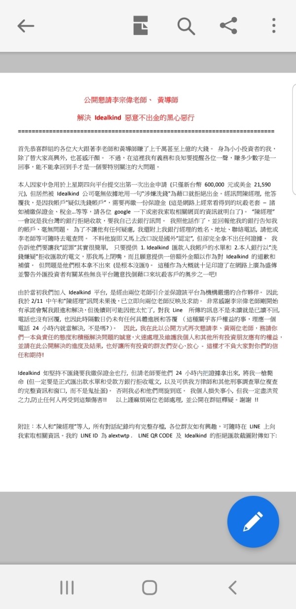 本人於元月經該平台業務介紹加入該平台,並與 2/10 第一次提交部份出金。該平台竟在毫無證據下以"涉及洗錢"為名拒絕出金,要求我要另付保證金。我請他們拿出證據, 並告訴他們如果有具體 證據我不但願繳稅 並願拿出出金的一倍金額,向他們道歉。他們完全與理會。最後大概因挺不住了,索性將我刪出群組。 這種毫無良知的黑心組織, 切盼貴平台能與曝光並處理。我在該平台的帳號為 3090517. 附上事發後我在該群組傳發的公開信,和該黑心平台拒絕出金的網頁。