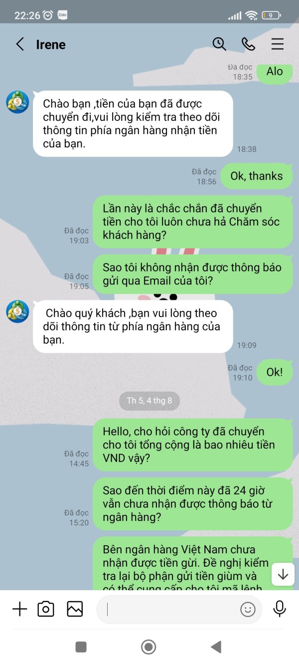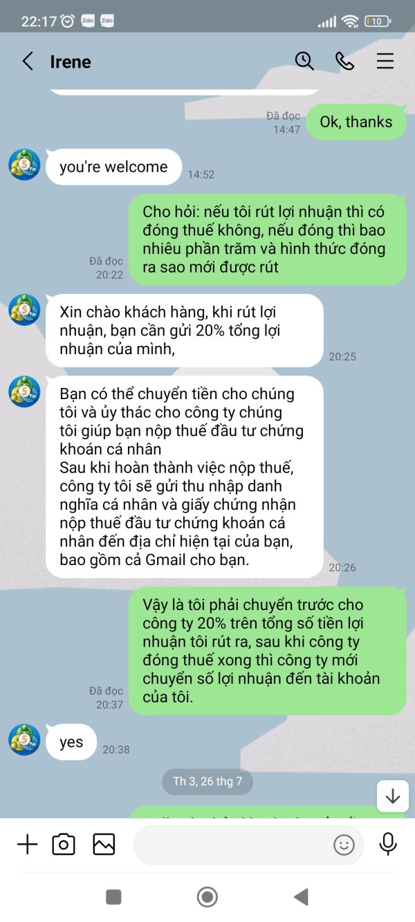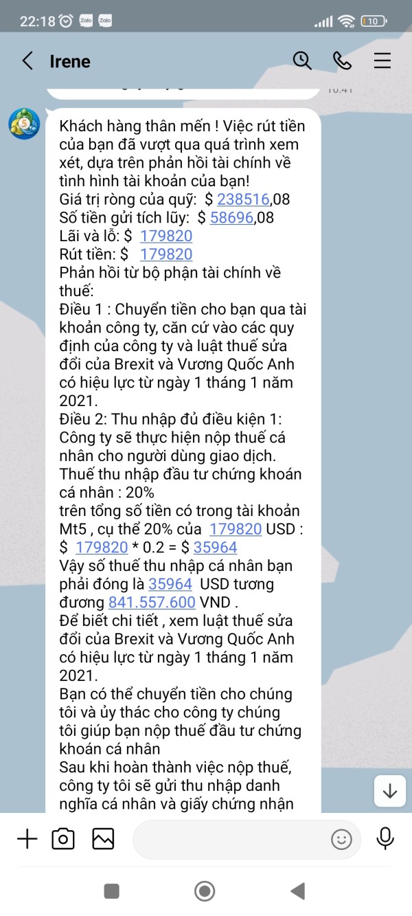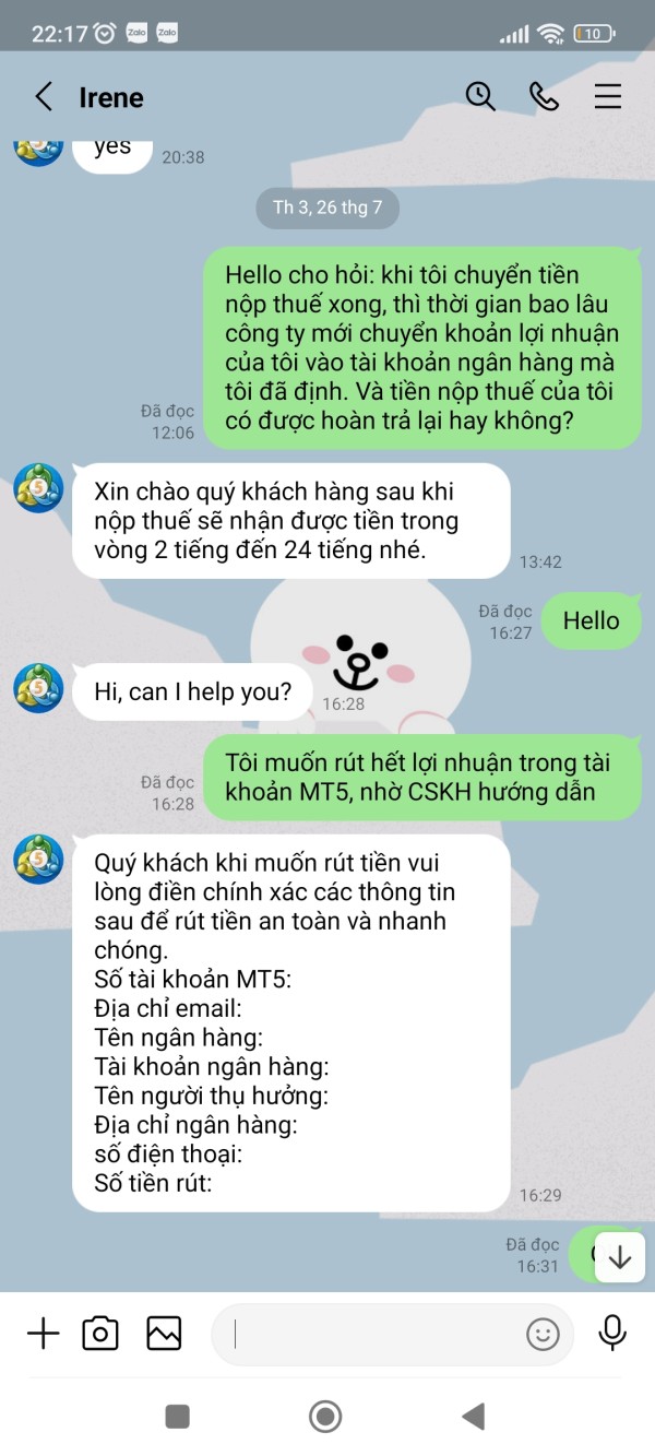 Tài khoản MT5 của tôi là 341053, Email: nguyenhoangphuongkl@gmail.com. Vừa qua tôi có đề nghị CSKH hướng dẫn tôi rút lợi nhuận với số tiền 179.820$, sau khi làm thủ tục CSKH hướng dẫn tôi rút tiền và đã thông báo tôi chờ nhận tiền nhưng đến giờ vẫn chưa được, CSKH đưa ra rất nhiều lý do nhưng không tư vấn cho tôi trước. Lần thứ nhất khi không thấy tiền về tài khoản, tôi hỏi CSKH thì nhận được thông báo tôi chưa đóng thuế 10% trên tổng số tiền tôi rút. Lần thứ 2: Sau khi tôi đã hoàn thành đóng thuế thì CSKH thông báo bạn đã được duyệt và chờ nhận tiền, chờ hoài không thấy tiền về tôi hỏi CSKH thì mới thông báo tài khoản bạn rút quá lớn không thể chuyển và đã bị đóng băng. Lần 3: sau khi tôi đóng phí mở băng và đóng phí chuyển nhiều lần vào tài khoản thì CSKH thông báo tôi chờ nhận tiền, đến khi tôi không nhận được tiền thì tiếp tục thông báo tiền tôi đóng thuế trước đó chưa thực hiện đóng thuế do Phó Giám đốc tình nghi bị tham ô tài sản khách hàng nên phải đóng phí ủy thác cho công ty đóng thuế giùm. Lần thứ 4: sau khi tôi đóng phí ủy thác thì CSKH thông báo chờ nhận tiền, đến khi tôi không nhận được tiền thì CSKH thông báo là do số tiền quá lớn không thể vận chuyển buộc tôi phải đóng phí lần nữa, vì phí tôi đóng trước đây công ty chưa hề nhận được, lý do Phó giám đốc bị bắt chưa chuyển cho sàn. Cho đến giờ vẫn chưa giải quyết cho tôi rút được tiền
