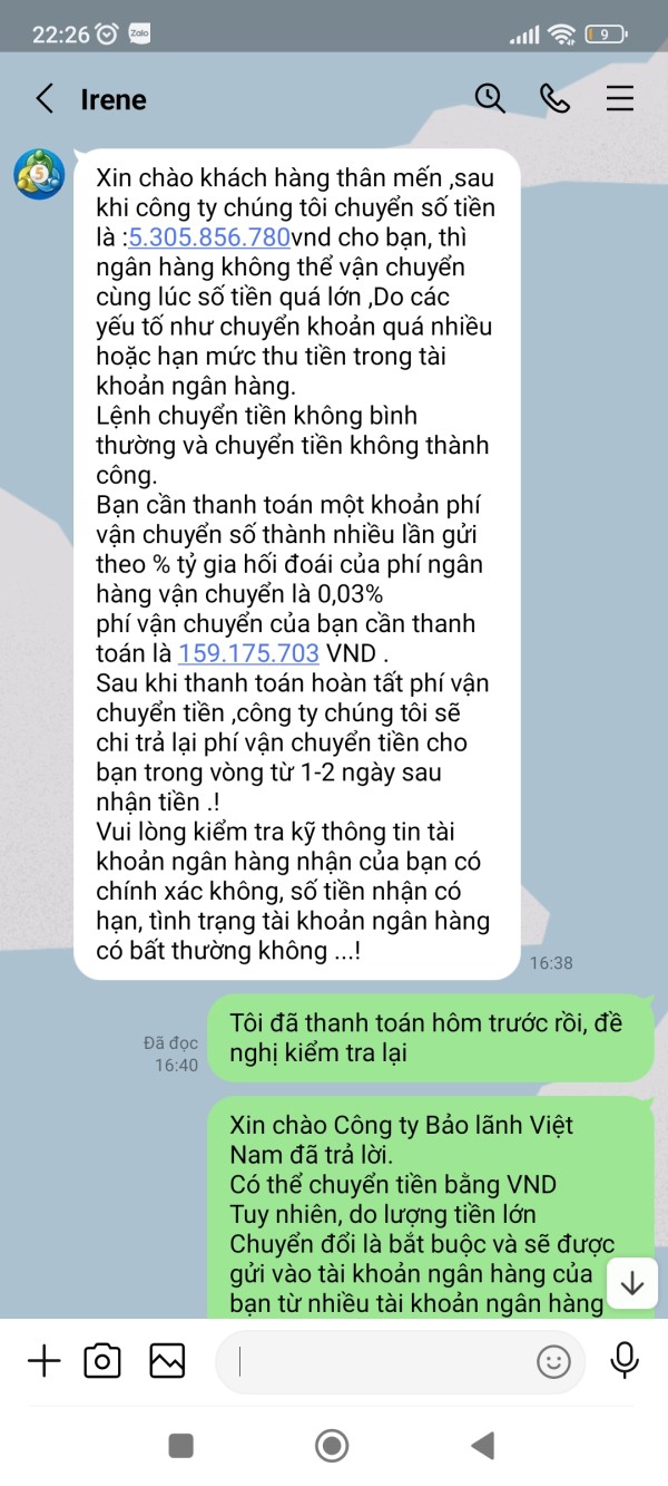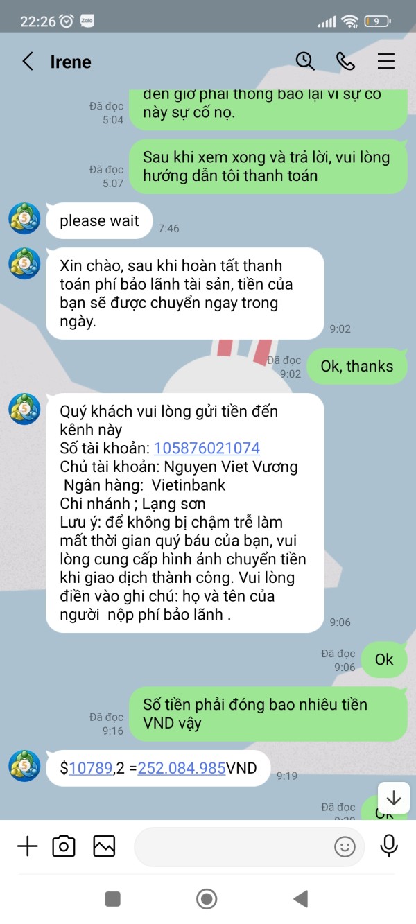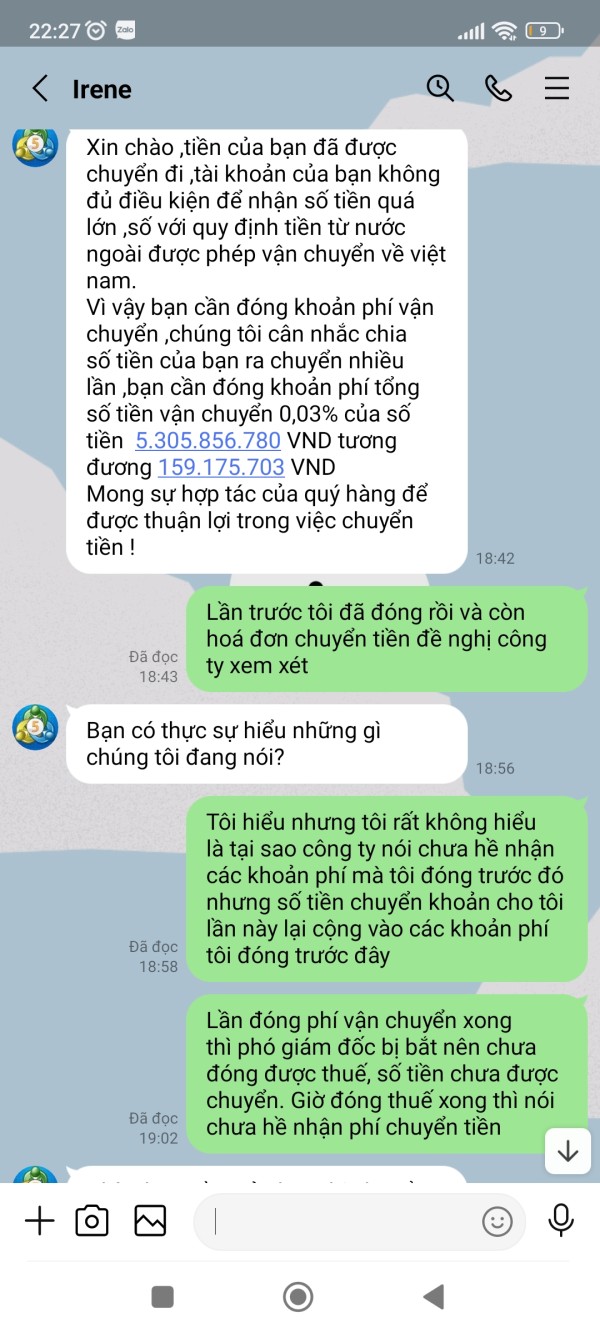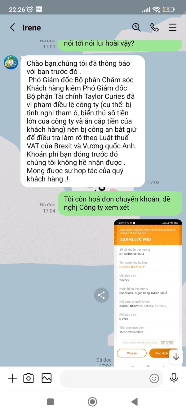 Tài khoản MT5 của tôi là 341053, Email: nguyenhoangphuongkl@gmail.com. Vừa qua tôi có đề nghị CSKH hướng dẫn tôi rút lợi nhuận với số tiền 179.820$, sau khi làm thủ tục CSKH hướng dẫn tôi rút tiền và đã thông báo tôi chờ nhận tiền nhưng đến giờ vẫn chưa được, CSKH đưa ra rất nhiều lý do nhưng không tư vấn cho tôi trước. Lần thứ nhất khi không thấy tiền về tài khoản, tôi hỏi CSKH thì nhận được thông báo tôi chưa đóng thuế 10% trên tổng số tiền tôi rút. Lần thứ 2: Sau khi tôi đã hoàn thành đóng thuế thì CSKH thông báo bạn đã được duyệt và chờ nhận tiền, chờ hoài không thấy tiền về tôi hỏi CSKH thì mới thông báo tài khoản bạn rút quá lớn không thể chuyển và đã bị đóng băng. Lần 3: sau khi tôi đóng phí mở băng và đóng phí chuyển nhiều lần vào tài khoản thì CSKH thông báo tôi chờ nhận tiền, đến khi tôi không nhận được tiền thì tiếp tục thông báo tiền tôi đóng thuế trước đó chưa thực hiện đóng thuế do Phó Giám đốc tình nghi bị tham ô tài sản khách hàng nên phải đóng phí ủy thác cho công ty đóng thuế giùm. Lần thứ 4: sau khi tôi đóng phí ủy thác thì CSKH thông báo chờ nhận tiền, đến khi tôi không nhận được tiền thì CSKH thông báo là do số tiền quá lớn không thể vận chuyển buộc tôi phải đóng phí lần nữa, vì phí tôi đóng trước đây công ty chưa hề nhận được, lý do Phó giám đốc bị bắt chưa chuyển cho sàn. Cho đến giờ vẫn chưa giải quyết cho tôi rút được tiền