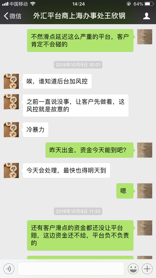 用电脑交易,并且网络畅通,交易的时候单子过好几秒进场,盈利了单子好几分钟平不掉,之前做十几手的时候以为手数大造成的,后来下0.1收还是卡盘滑点,造成严重亏损,有视频作证,联系平台业务员,说是明天故意风控了我的账户。