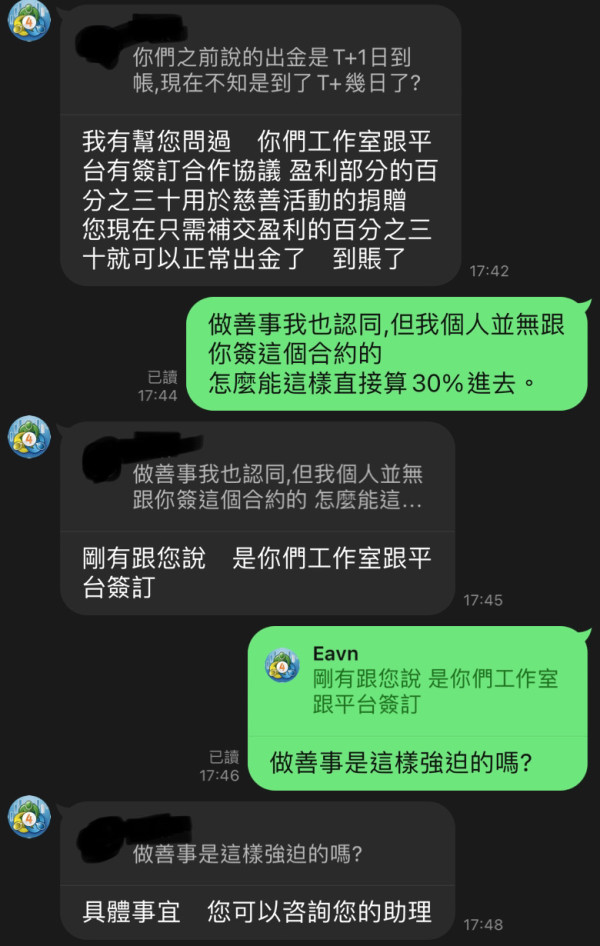 一開始出金2次(110 USD),後來獲利後要再出金,整個過程中就是許多理由、推託…等種種原因不出金。 最後說,因為工作室裡的老師跟他們(券商)簽訂了有獲利就要繳其中的30%來做善事,才能出金 而且這30%不是從獲利中扣除,而是要另外再繳交30%才能出金。