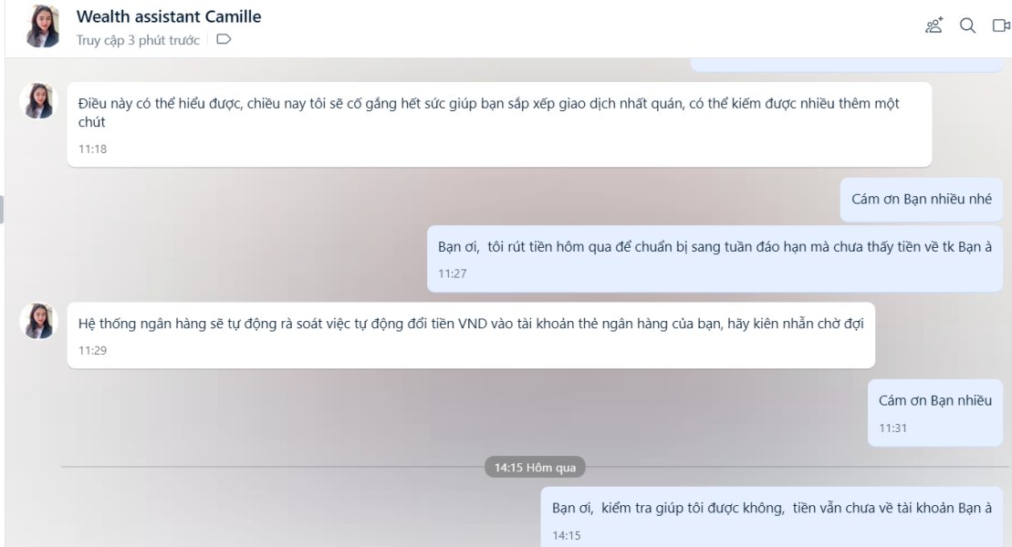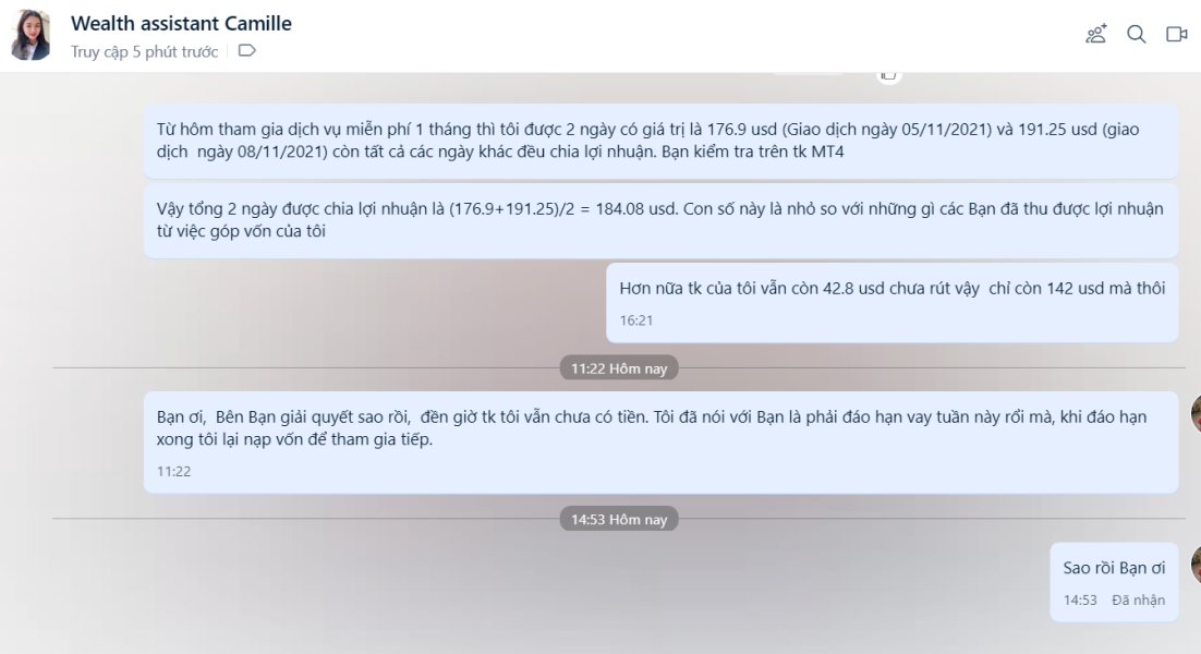 Tôi tham gia đầu tư ủy thác có chia lợi nhuận với Rosytle Wealth Tại Việt Nam, có ký cam kết. Ngày 10/11/2021 tôi có rút 5000 usd và ngày 12/11/2021 tôi rút 9000 usd, tổng 2 đợt là 14000 usd nhưng đến nay tiền vẫn chưa được chuyển vào tài khoản cá nhân Tôi đã liên hệ với bộ phận chăm sóc khách hàng thì được giải thích là Hệ thống quy đổi bị tắc nghẽn, tôi thấy lý do không chính đáng, có DẤU HIỆU LỪA ĐẢO hòng chiếm đoạt tiền của các nhà đâu tư trong đó có tôi. Vì vậy tôi đưa thông tin lên đây để cộng đồng mạng cũng như các nhà đầu tư đang tham gia vào sàn Rosystyle này biết.Tôi đề nghị Rosystyle trả lại tiền cho tôi