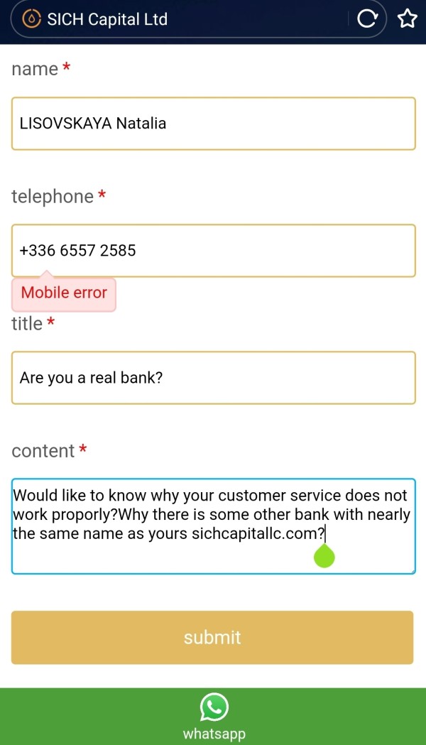Impossible to contact via site Sich Capital