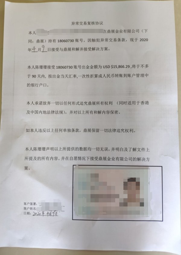 我和我朋友在2019年7月份在鼎展金业进行交易期间一直正常,出入金业正常。而后在2020年3月份开始盈利,鼎展金业就以异常交易关闭我和我朋友的出入金通道,并关闭后台不让交易。而后更是强行要求我们签署协议,扣除所有盈利并按协议要求在90天内退还本金。后协商无果,被逼签署下协议,只能在4月8号和4月9号签署下协议,在2020年7月8号和9号退还了我的本金。因为新冠疫情,鼎展金业有恃无恐,知道我们根本去不了香港投诉维权,期间电联交易热线,客服热线无人接听,咨询客服爱答不理,在7月20号开始客服也没有任何回复。因香港鼎展金业是明星代言,且按页面宣传有地产代理和理财策划,安全运营七八年,还是香港贸易场AA级会员,所以我才会在他们公司进行交易,没想到是这样的黑平台。强制要求扣除所有盈利和返佣,并扣押本金长达三月之久,不给任何回复。