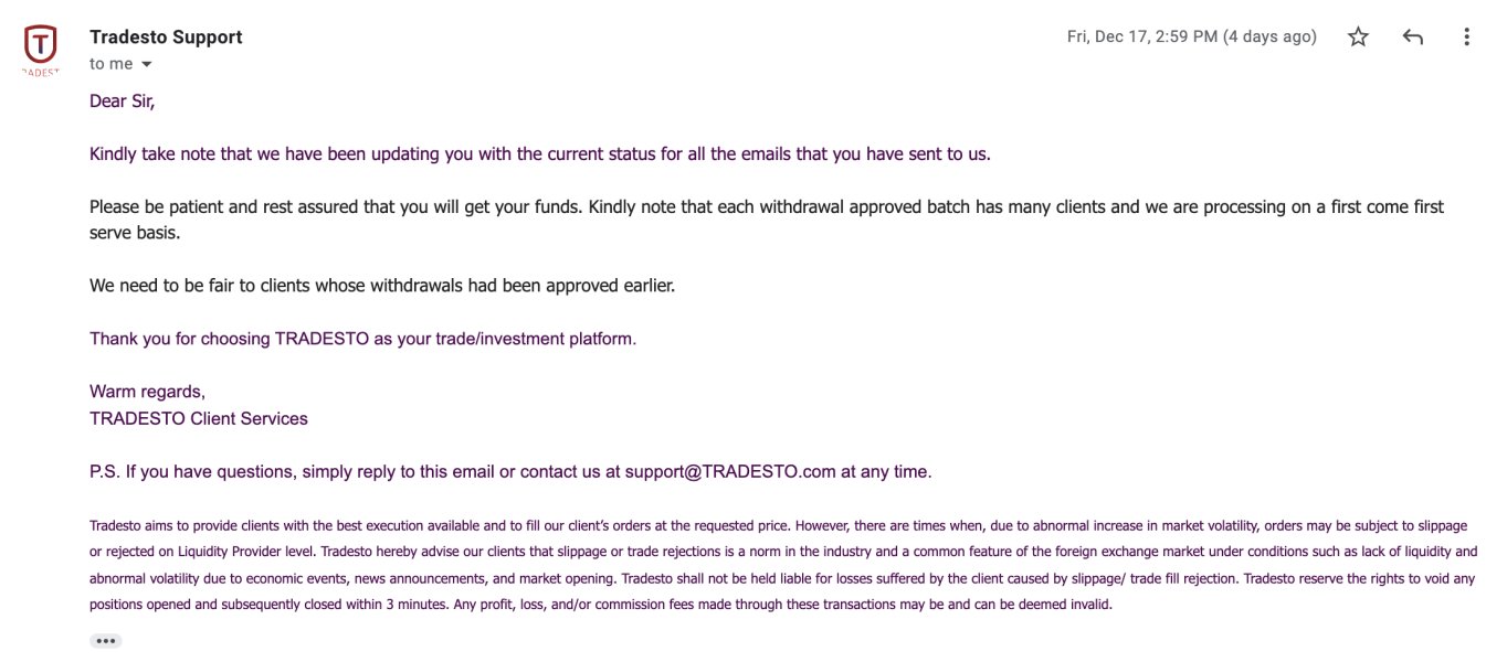 Withdraw about 1 month ago, I contacted the customer support but reply me with meaningless reply. They don't give a timeline for the withdrawal. Tradesto confirm is the scam. If anyone can help to get back, I don't mind to give some tips. The best is let them shut down and get sue.