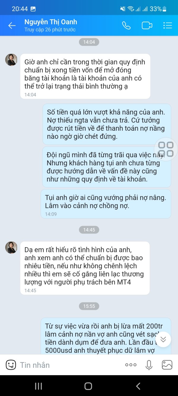 Đội ngũ QLTC thực hiện giao dịch nhất quán xong báo là tài khoản lợi nhuận hơn 190% nghi ngờ bất thường rửa tiền. Yêu cầu tôi nộp thêm để chứng minh năng lực tài chính. Don số tiền lớn tôi không đáp ứng nổi. MT4 đóng băng khóa tài khoản không cho rút tiền.