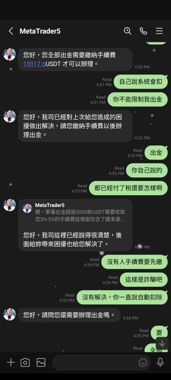 無法出金,用各種名目要求再繳錢 稅收,手續費等等,不繳平台客服把line 封鎖,我的帳號也關閉無法登錄