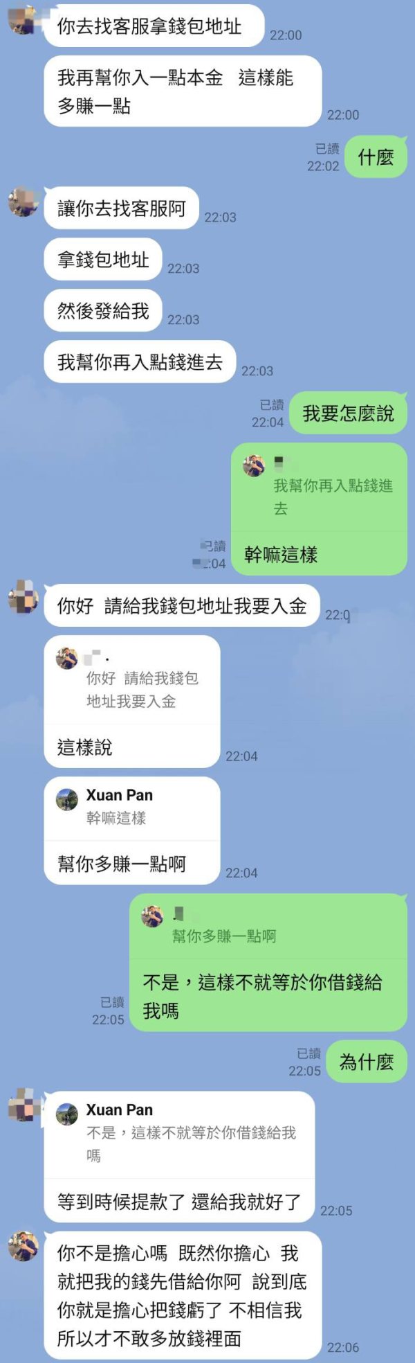 之前是在交友軟體認識的,他有發一張圖片是電腦螢幕,畫面是類似股票的那種,我就問他你是不是有加密貨幣,他說我怎麼會知道,因為我朋友也有在做短期,就有聊到這塊,有聊到我的工作,他說加密貨幣滿熱門的打工方式,用自己的錢去賺,所以他說要帶我做一次短期,因為我網銀沒那麼多錢,所以先用一萬元台幣去試,就是他給我的那個網址做,真的是有多賺到2000塊台幣,也確定有入帳,到後來他說後面還有比較好的趨勢,說要帶著我做,要我再入金,我就只有用我僅有的12000再去做一次,他說他要幫我再入點本金可以賺多,所以他不顧我的話(我沒有要跟他借錢的意思)要我去賴客服拿地址入金,他入了15萬,說要幫我賺多一點,結果我還真的照做了😔,然後前兩天他有帶我做短期,有賺到錢,就是我給你看到客服傳的訊息,要繳稅金21萬多,我傻了,我不知道該如何做,於是有求助有做過加密貨幣的朋友,他們有幫我求證,這網址真的是詐騙網址,我還去BitoPro官方求證,是沒有先繳稅金再出金的規定,要我不要再入金到那個網址,我朋友怕我亂想,就幫我把這個人封鎖還有客服跟貨幣商的賴都封鎖拉黑