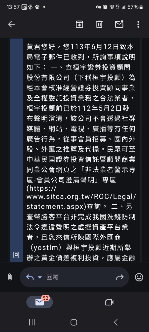 該國際外匯商宣稱(yostlm Saafan Marktes)與台灣投資顧問公司(桓宇)近期舉辦所謂的黃金價差複利投資(CFD),該平台於2024.05.15至聖盧西亞當地註冊,不足一年也並非是NFA會員,而國內投資顧問公司(桓宇)經本人電話中詢知,該公司並無所謂的line群組及複利投資計畫,並且不是國內合法期貨商。然而該國際外匯商(yostlm)表示操作該計畫必需跟兌換商(幣勝客)以面交現金方式取得USDT虛擬美金才得以在Meta Trader5操盤外匯,且入金金額最低為台幣十萬及要求獲利分成將近一半給予外匯商,該平台未有設定負餘額保護,因疑似被設計而造成穿倉(五千多塊美金及保證金3200美金),現該外匯商(楊宗興)要求將負數餘額補齊,否則將以公司名義(yostlm Saafan Marktes)提告... 同時本人發函至期證局求證,該國內投資顧問公司(桓宇)已於民國112年5月2號發佈聲明澄清,該公司不會透過社群媒體、網站、電視、廣播等有任何廣告行為,從事會員招募、國內外股、外匯之推薦及代操。 由此確定此外匯為詐騙風險極高平台。