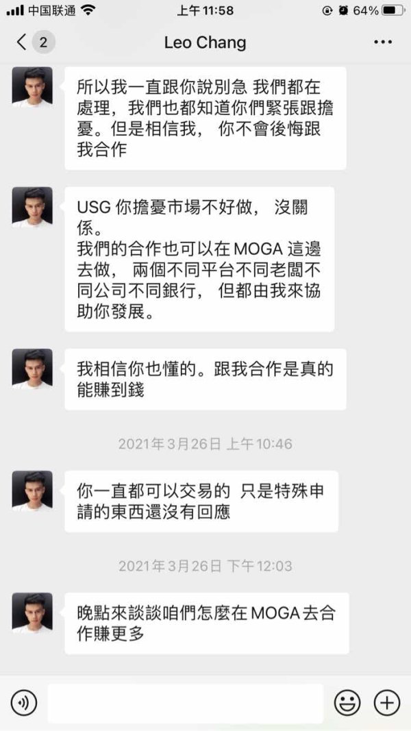 这个客户经理天天就知道忽悠我到MOGA继续入金,2020年八月份出金到现在也不到账,不拿出实际行动让资金到账,还天天忽悠,一周之内不到账我就投诉支付商