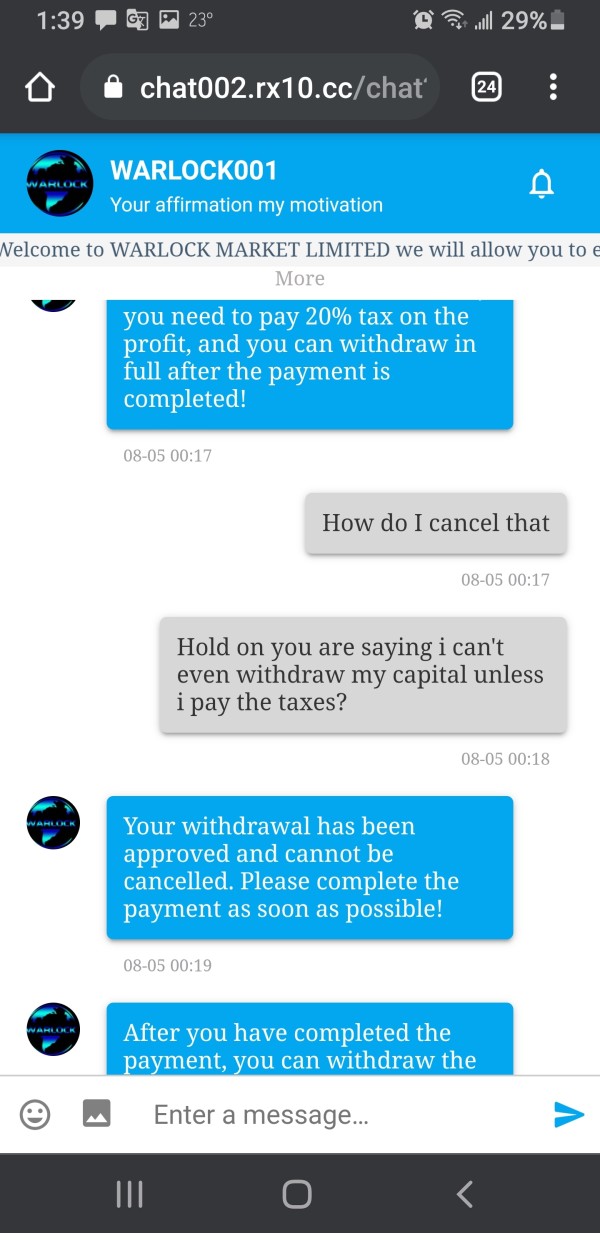 I transfered 30k to this company to do some trades, after a couple of weeks I made some profit on MT5, I borrowed some of this money, now that I try to take out money to pay the loan I got, they are telling me that I have to pay 20% tax on the earnings before I can take out any money, and I have to wire the money taxes, I told them they can take out from the profits, but they don't do that, they also claim to be regulated by FDA in US, but they are not I think I got scammed