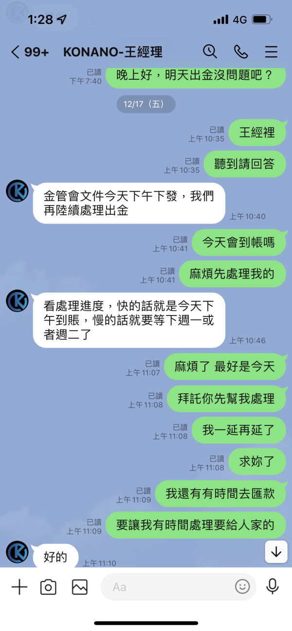 完全不出金,訊息不讀不回