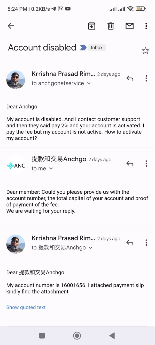 i deposit money and trade from anchgo . i earn some money. at now suddenly they deactivated my account and said pay 2% fee and your account is activated and i pay fee. but now ask pay extra fee. if you not pay fee your account is bloce permanently. dont believe anchgo.