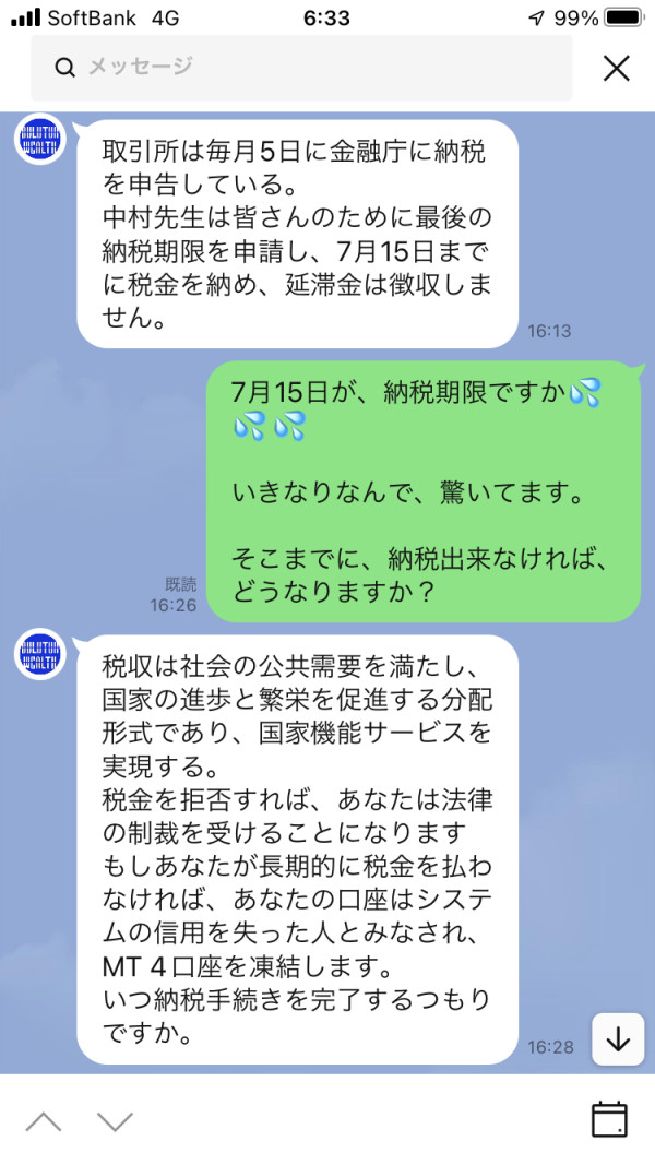 知人の紹介で、Bulutun Wealthで口座開設し、小額から取引を始めました。 順調に利益をあげ、目標利益を達成したので、出金しようとすると、 先方の投資顧問より、 「差益で発生した税金を先に収めないと出金出来ない。税率は、20.315%。税金は、FX口座の資金は使えない。現金で振込みする必要がある。日本の金融庁にも届け出をしており、確定申告一本化法という法律に基づいている。」 と、伝えられました。 当初、出金する歳に、差益が発生した時に、税金分を現金にて支払いしないと、引き出し出来ないという内容は、伝えられておりませんでした。 知り合いや、弁護士に確認した所、その様な法律は聞いた事が無い。 そもそも出金するにあたり、税金を先に支払いするという事自体おかしいと、伝えられました。 どうしても、違和感を拭えず、詐欺では無いかと感じています。 また、利益も発生していて、元本となる資金も入れていますので、出金して、しっかりと納税し、良き国民で有りたいと思います。 原因調査、真相解明、問題解決し、何とか引き出しが出来るように、お願い致します。