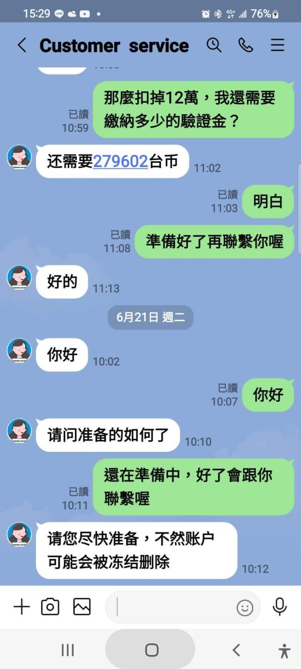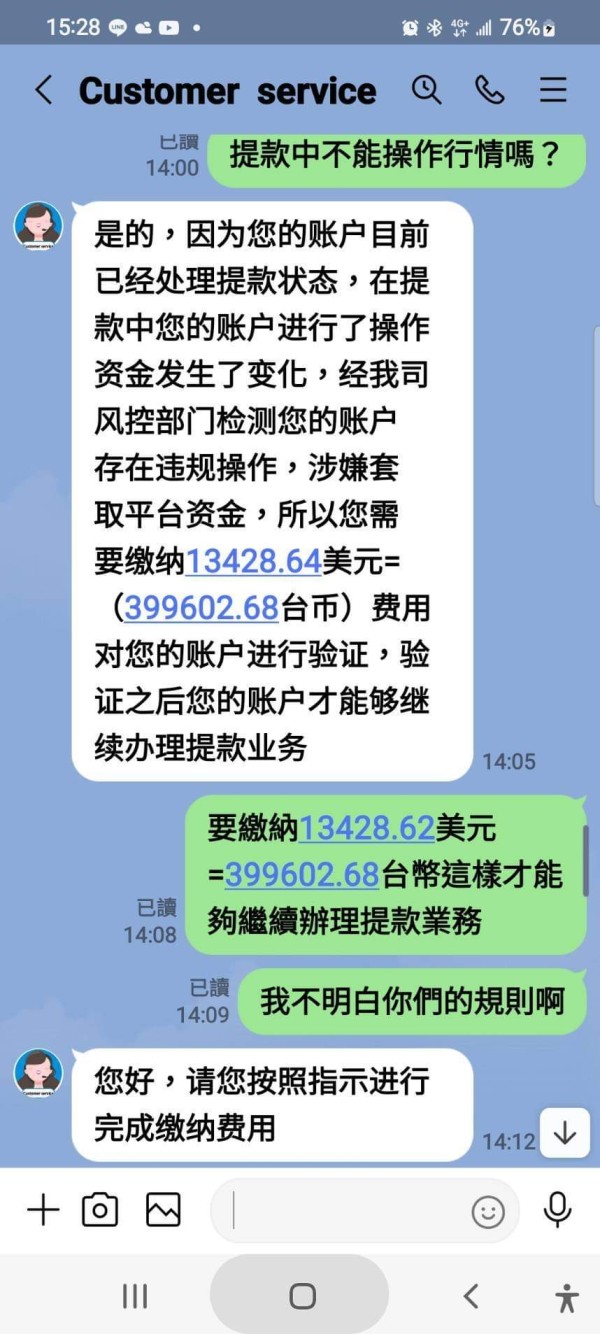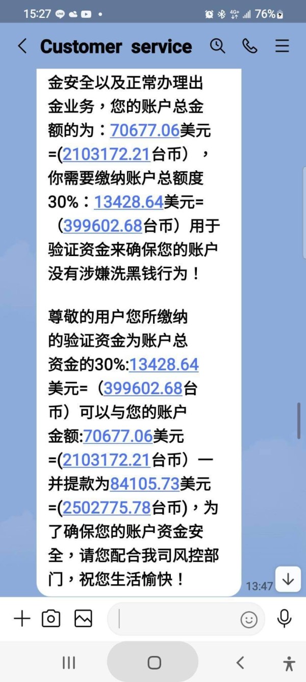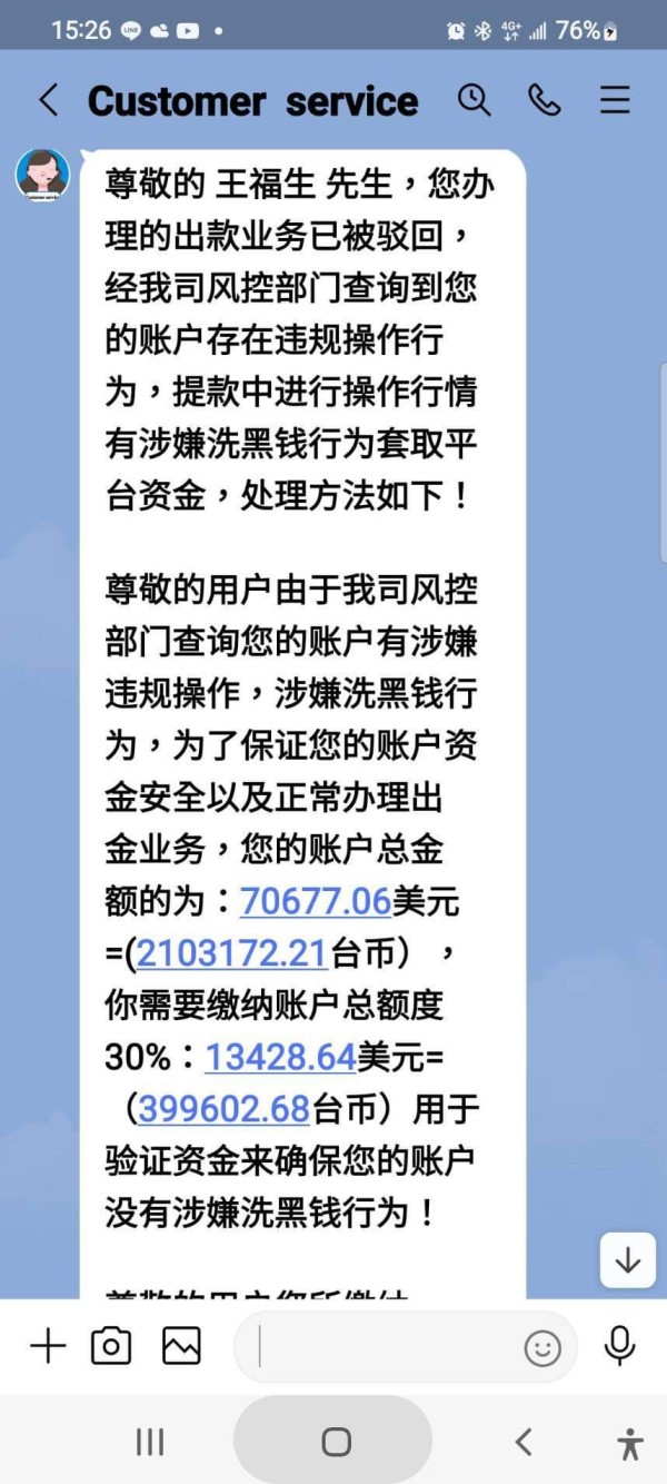 請問一下我有申請出金,網站維護後我一直沒再登錄帳戶,後來有朋友教我重新登錄,登錄後再操作行情,操作完不久,line客服就聯繫我說我這樣涉嫌洗黑錢,必須繳納30%保證金來證明不是洗黑錢,30%對我來說已經粉多我沒辦法了,期限內不繳納就要凍結帳戶跟刪除,請問VOREX卷商可以隨意刪除客戶的帳戶嗎?裡面的錢是客戶辛苦的血汗錢啊,請問我要如何做才能完全提領我外匯帳戶裡面的錢呢? Excuse me, I have applied for a withdrawal. After the website maintenance, I have not logged in to my account. Later, a friend taught me to log in again, and then log in to operate the market. Soon after the operation, the line customer service contacted me and said that I was suspected of money laundering. 30% deposit to prove that it is not money laundering, 30% is too much for me and I can't help it. If I don't pay within the time limit, I will freeze the account and delete it. Can VOREX dealers delete the customer's account at will? The money in it is the hard-earned money of the customer. What can I do to completely withdraw the money in my foreign exchange account?