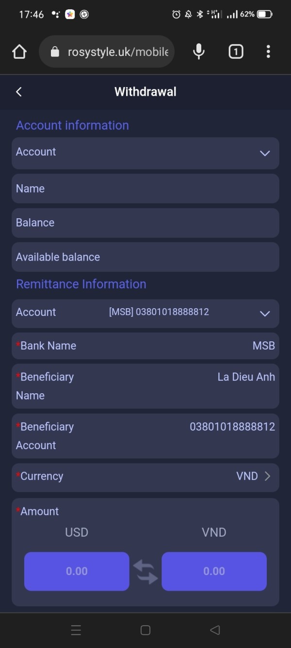 Tôi đã nạp tiền vào sàn tổng cộng 28.500$ vào các ngày 06.06.2022 (9000$), ngày 13.6.2022 (3000$), ngày 27.6.2022 (11000$) và 29.6.2022 (5.500$). Vào ngày 07/07/2022, tôi có thực hiện giao dịch và thu được lợi nhuận rất lớn trên 100% vốn của tôi. Tuy nhiên CSKH nói tôi cần nạp thêm 50% vốn, do lợi nhuận quá lớn, bất thường. đến hôm nay họ không cho rút tiền và đã xóa sạch số tiền trong tài khoản của tôi. số tiền quá lớn