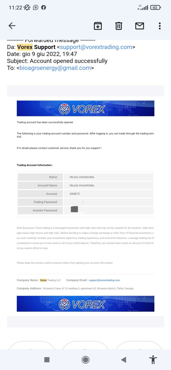 Hi, I'm Nicola Ventafridda and I have two VOREX accounts (initially FXKOVNER): no. 684870 (with a balance of 8,849,549.09 USD) and no. 684873 (with a balance of 395,200.00). When I tried to ask to withdraw sums from the accounts I was told that I would have to pay 10% of taxes without any reason (see the ASIC's answer about my question) and above all on the balance of both accounts. Attached are the screenshots of the proofs of my statements. I believe I have the right to recover my sums and pay taxes to my country.