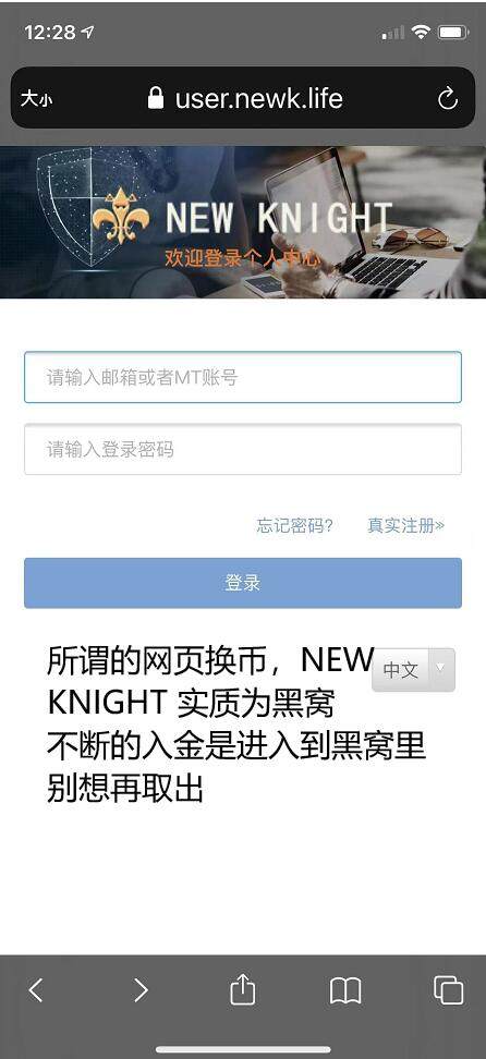 黑交易商NEW KNIGHT GROUP LIMITED 挂在MT5平台进行交易,利用换外汇入金,当申请出金时,严卡,网上唯一联络方式为一个LINE在线客服,该所谓的官网虽注册在澳大利亚,但无任何正规企业税号、营业地址及联系方式,唯一能联系的只有邮箱。根据在MT5捆绑的信息查询,是来自香港的一个网络公司地址,也就是APP可以随时高产量复制。所谓“推荐人”带你的时候根本不给你时间去搜寻资料,并且会淡化隐藏的黑交易商。仅仅告诉你NEW KNIGHT 只是个换币公司,实质所有资金都控制在NEW KNIGHT 账户里,而非MT5里。当申请出金额较大时,都遭拒,并告知要缴纳更多的保证金,才能解冻资金,无疑是个无底洞,黑户。遇到了骗子。当理清之间关系时,为时已晚,对于骗子手法不断更新的同时,要么不做,要做的还是得花时间好好鉴别。