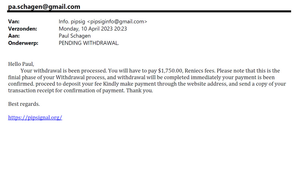 I have been scammed. He approached me through the official youtube channel of https://www.youtube.com/@CryptoCrewUniversity. And it looked to me that it was really Youtuber Steven Courtney. Scammers business whatsapp account (+1 (469) 894-4306) still active. So i did anwer his whatsapp message. The way he talked was exactly how Steven talks on his YouTube channel. That was october 2022. He persuaded me to invest in www.pipsignal.org. To avoid my losses at Binance and slowly earn back in crypto. Started with a small amount but he convinced me to invest more and more the last months for long term investment. Because it was the time to invest with the current market. I also saw my wealth grow slowly. So...no problem I thought. And of last year I had to buy a mining software: cgMiner OS +. A few weeks ago I wanted to withdraw my investment (35.352,633USD). Then I had to pay Fee (taxes) after Fee. The last Fee I did not paid. I became suspicious. Try to withdraw with smaller amout, but nothing happens. My emails were no longer answered. Very simple they won't let me withdraw. I was scammed. Boiler Room Scam. Both the website and the Whatsapp number are still active! I sent a total of ADA: 5134.90834200 and BTC: 0.70863814 (€ 19.097,50) All our savings lost to the scammer. I have kept all screenshot and email whatsapp and other documents as proof. Plus a complete overview of the payments made via Binance.Scammer Wallet: ADA: addr1v89wcds4nv66te82hpkzc7fu8wrp0qpv5l8zfe2vxfa5h5sga52s4BTC: bc1qjw25p3k2agqzfgnm5a4agawa0q66t7jtx605xvBTC: bc1qtkefer2p7lkmcm2tjmsz0q8plw5kmsuanthyep How could I be so stupid to fall for this. Life is hard enough with 2 autistic children. Wanted to make life a little more bearable for our family. But the opposite has happened. Nowhere to go in the Netherlands. Crypto is not yet regulated!