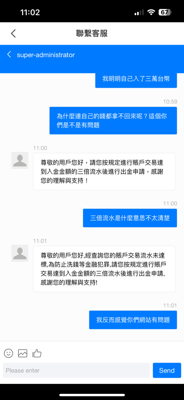 明明裡面有放入台幣三萬第一次確實賺到快8千,第一次我出金拿到到快38000 我後續在丟入3萬,在網路認識一個說是住香港,他說幫我入一萬港幣,一開始我還不相信有人這麼好,最後我想把他的💰環他,想拿回我投入的三萬回來,可是一直顯示交易流水不足,再來就顯示無法提領,我是遇到詐騙的網站了嗎?