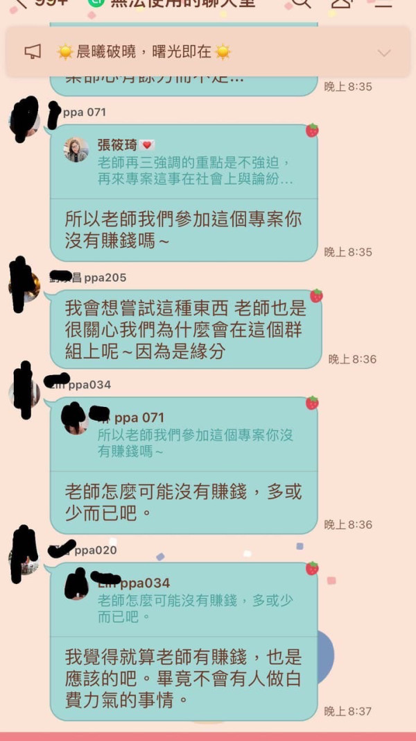 群組裡面的張老師一直洗腦大家入金投資收益相當高也很多人證實,我腦波一弱就刷卡三萬投入,原本說好能翻10倍但後來都沒有還要投入更多錢,我才覺醒是詐騙,現在已經打算報警處理了,分享給大家希望大家別被騙群組裡面都是他們的人!