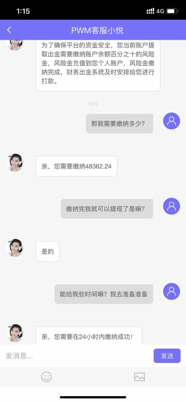 通过一个人的微信朋友圈了解到,外汇交易,说他们公司有技术能一对一带你赚钱,说是赚取平台的钱,我抱着侥幸心理想说投资点试试,结果分析师说投资金额太少操作空间有限,让我追加投资。本来我只想先投三万元试试,结果追加投资后本金就是七万五千元了。充值完开始操作结束说我有漏单,让我交上162700让我补仓才能进行下两轮操作,三轮都操作完就可以提现了。我就觉得不对劲,骗人,我被骗了。后期又充值2万5千元,也不能提现,平台说我存在异常,也是让我缴纳风险金,总金额的百分之十,总金额是483622.4,百分之十那就是48362.24。越想越不对劲,马上打电话报警,去派出所报案立案。