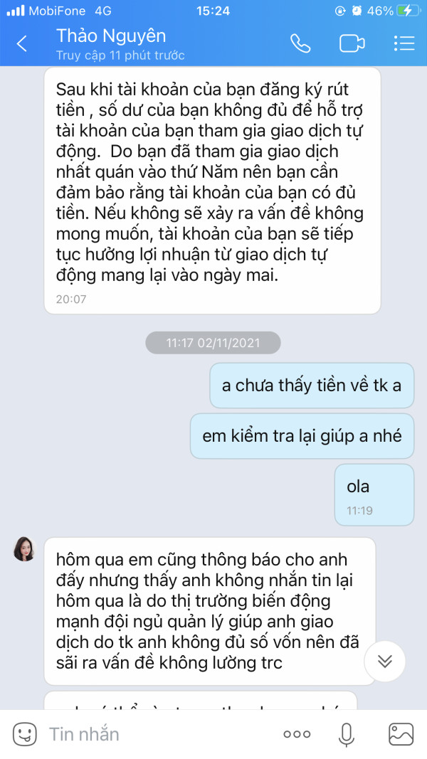 Tôi đã nạp tiền vào sàn giao dịch này với số tiền 10000$. Sau đó tôi thấy sàn này đáng ngờ nên tôi đã làm lệnh rút tiền và sàn này không giải quyết lệnh rút tiền của tôi. sau đó sàng tự vào lệnh giao dịch tài khoản tôi và làm cháy tài khoản. Đến hiện tại còn số tiền còn lại trong tài khoản 1200$ cũng không có cách nào rút ra được và cũng không liên lạc được với bất kỳ ai bên sàn này.