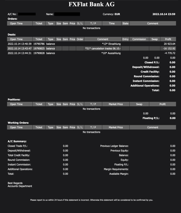FXFLAT ist eindeutig ein Betrugsunternehmen, das die Zahlung von Kundengeldern widerlegt. Nach ein paar Tagen des Handels mit Scalping beantragte ich eine Auszahlung und sie lehnten einfach ab, deaktivierten mein Konto und löschten meine Gewinne und behielten mein Geld für 1 Woche, nach der Anfrage schickten sie mir nur meine Einzahlung. Wenn ich im Live-Chat frage, warum mein Konto deaktiviert ist, antworten sie einfach und warten auf eine E-Mail! Was ist das für eine Professionalität? Ein Haufen Amateurbetrüger!!! HIER NICHT EINZAHLEN! BLEIB WEG!!!!!!