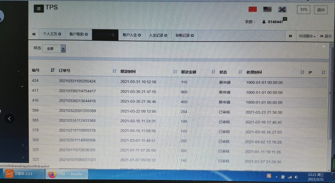 tps平台在2021年3月30号晚上6点左右交易软件显示账号被禁用,随后通过后台网站出金,不过后台网站也无法打开,并且出金一直未到账,共有1473美金。