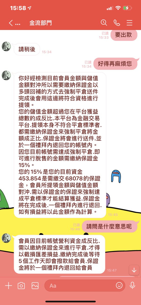 先由一位陳小姐在網路上找代操盤的職缺,求職者接洽後會再轉給操盤專員,帶領操盤獲利獲取一半佣金,佣金需要先付款才會給妳提領,之後要跟平台提領出款,一開始說戶頭打錯帳號需要四倍交易量,後來達成交易量,卻說要保證金才能出金,匯了保證金之後又說卡在國外瑞士銀行有匯差還要再匯款!就是不出款!