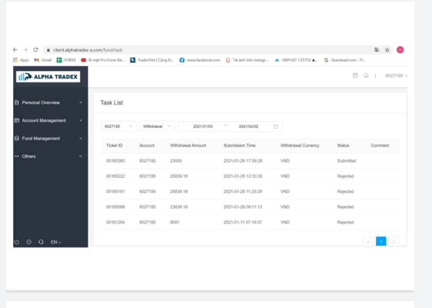 I have a copy of Master account at Alphatradex (copytrade) with 06 accounts but only 1 day to 2 weeks, the accounts stopped tracking from 11/04/2020, and most of the accounts are negative 50% of the capital. , we continue to fund those accounts to trade with a total amount of 32,000 USD. From October 8, 2020 to November 30, 2020, withdrawals are still taking place as usual, but from December 1, 2020, Alphatradex considers that some accounts are hedging and the account is closed. lock up.