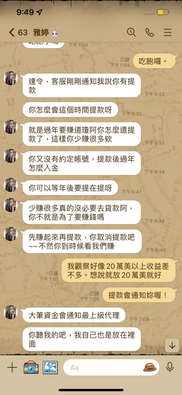 自稱高欣證券投顧助理陳雅婷誘導加入量化外匯交易,每天投穩定穫利。直到最後要出金時。資金直接變負值。客服都是詐騙集團