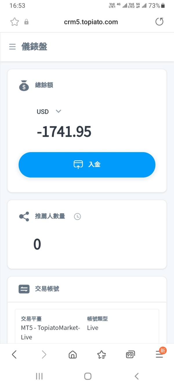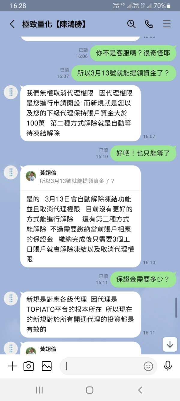 TOPIATOký vào thỏa thuận và đặt cọc, nhưng họ lừa đảo tôi và bỏ trốn mà không có tiền bồi thường. nó gây ra thiệt hại 2536241,19 đô la và không thể rút.