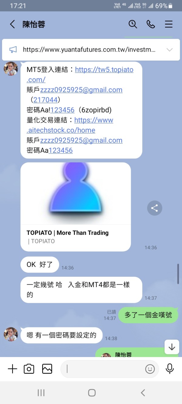 2021年9月份認識一位女生,聊天一陣子,到10月多請我加入外匯做交易,前後共入了3萬美金做交易,直到2022年的2月13日,我要出金台幣50萬但帳號卻遭到凍結,我還問客服,客服卻回我要等一個月後才能解除凍結或是馬上入3萬美金當做保證金就能馬上解除凍結。一個月過後直到3月13號的前一天,我打開帳戶看才發現裡面的錢都被故意輸光了