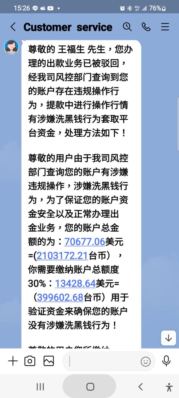 請問一下客服說我涉嫌洗黑錢,可是我是朋友教我操作行情,怎麼說是洗黑錢呢?我有申請提領出金,因網站維修後我都沒有登錄帳戶,朋友教我登錄後順便操作行情,可能他也不知道這樣子不可以,客服說要我繳納總額的30%當保證金,可是這對我來說已經是非常大的負擔,不在期限內繳納帳戶會被凍結刪除,請問卷商可以這樣做嗎?這是我們辛苦賺的錢啊~